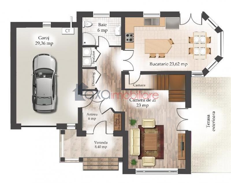 PRIMUL NIVEL: garaj, 1 hol, 1 antreu, 1 living, 1 terasa, 1 dressing, 1 spalator, 1 baie, 1 bucatarie, 1 camara, 1 scara interioara.
