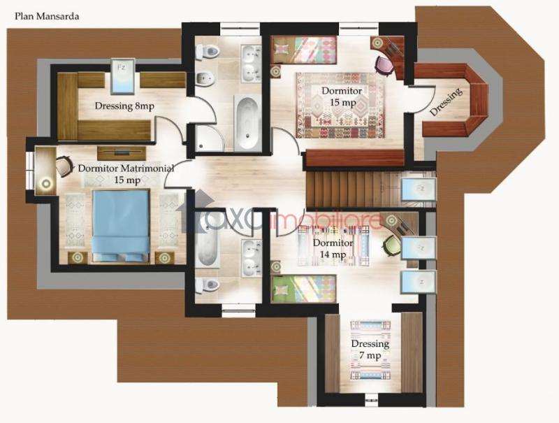 AL DOILEA NIVEL: 1 dormitor matrimonial (cu 1 baie proprie si 1 dressing), 2 dormitoare (fiecare cu cate un dressing), 1 baie comuna, 1 hol.