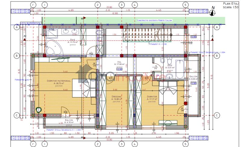 ETAJ / AL DOILEA NIVEL: Hol, 1 dormitor matrimonial (cu baie proprie si balcon), 1 dormitor simplu, 1 dressing, 1 baie, 1 balcon.