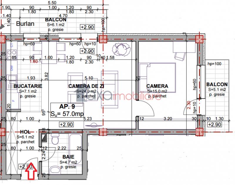 Apartamentul dispune de o suprafata utila de 57.3 mp si de compartimentare semidecomandata.