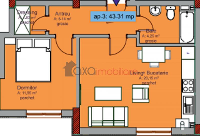 Imobilul are o suprafata utila de 43.31 mp, iar compartimentarea este semidecomandata astfel: 1 living cu 1 bucatarie de tip open space, 1 dormitor, 1 dressing, 1 baie si 1 hol.
