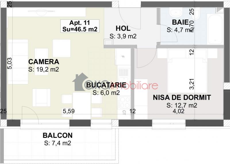 Suprafata utila este de 46.5 mp, compusa dintr-un living cu 1 bucatarie de tip open space, 1 nisa de dormit, 1 hol, 1 baie si 1 balcon (7.4 mp).