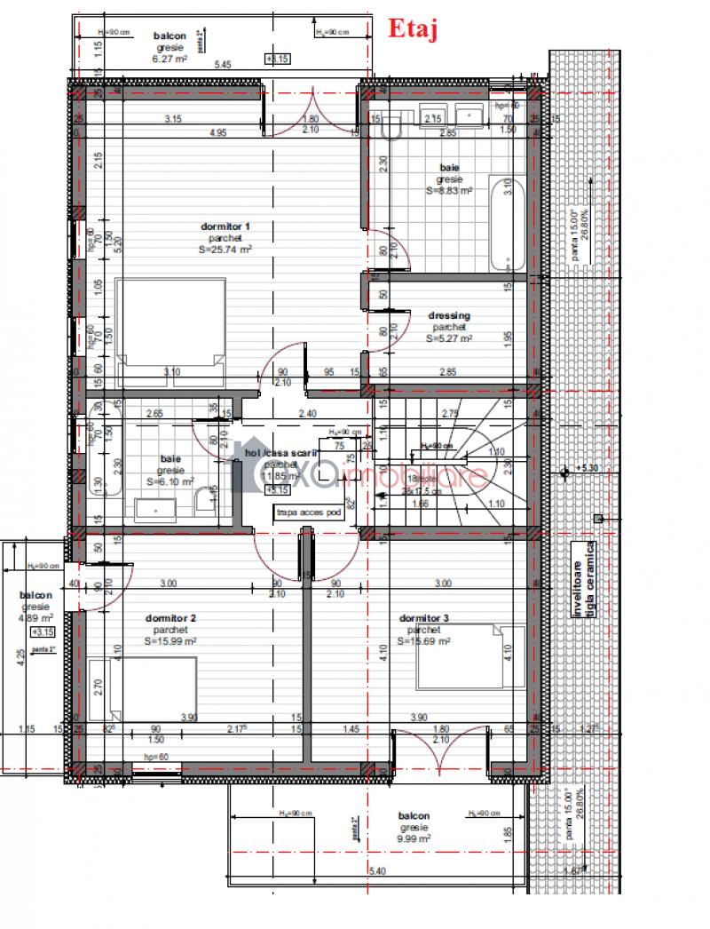 Al doilea nivel: 3 dormitoare, 2 bai, 1 hol, 1 dressing, 3 terase. (Unul din dormitoare dispune de dressing si baie).