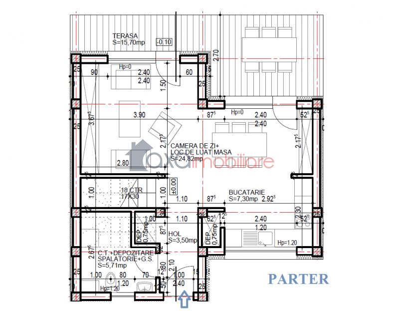 PARTER / PRIMUL NIVEL: 1 living, 1 dining, 1 bucatarie, 1 hol, 1 baie, 1 terasa, 1 spatiu pentru depozitare, camera tehnica, casa scarii.