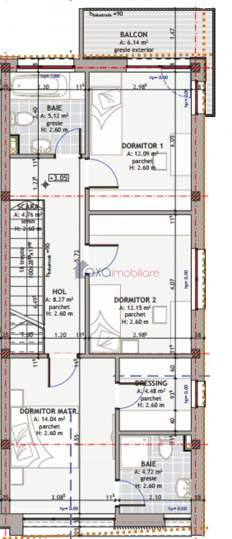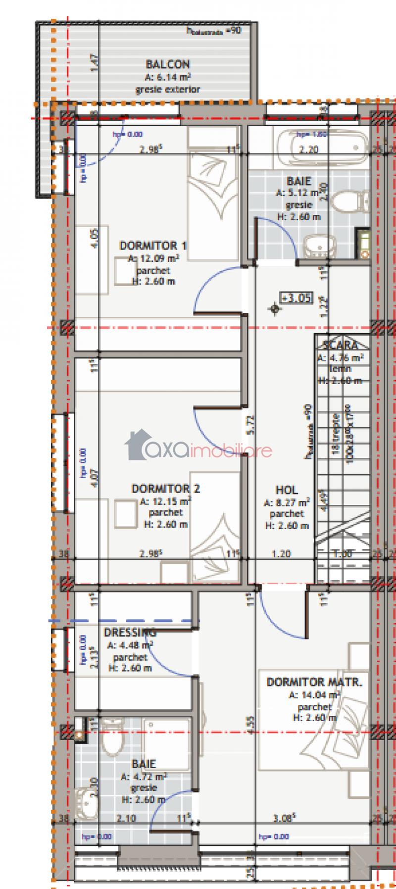 ETAJ 1: 1 hol, 2 bai, 1 dressing, 3 dormitoare, 1 balcon.
