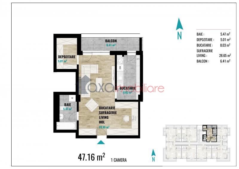 Suprafata utila este 47.16 mp si dispune de compartimentare decomandata (1 hol, 1 spatiu pt depozitare, 1 camera, 1 bucatarie, 1 baie si 1 balcon).