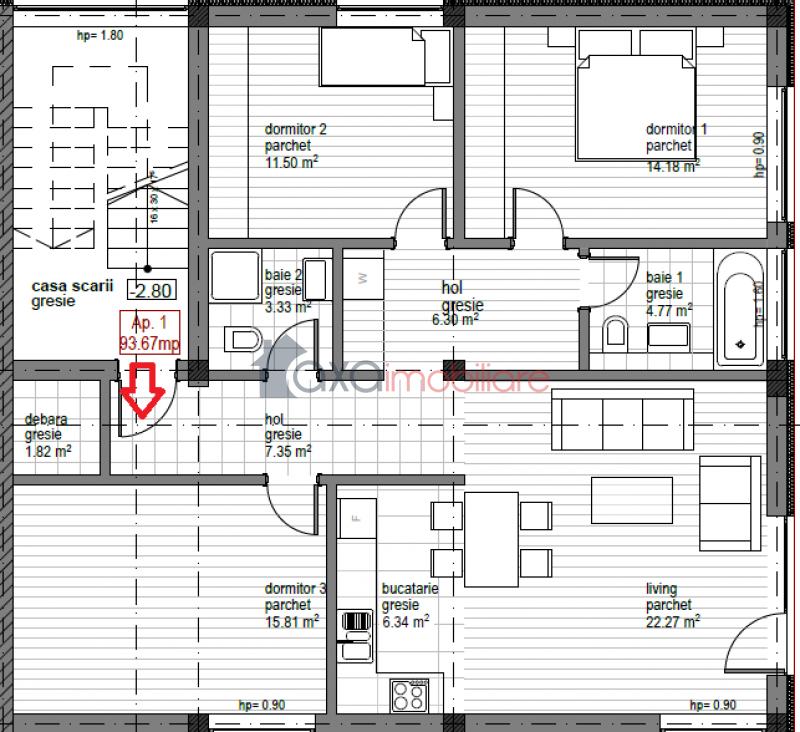 Compartimentarea este semidecomandata si foarte bine gandita; imobilul fiind compus dintr-un living cu 1 bucatarie de tip open space, 3 dormitoare, 2 bai, 1 debara si 2 holuri.