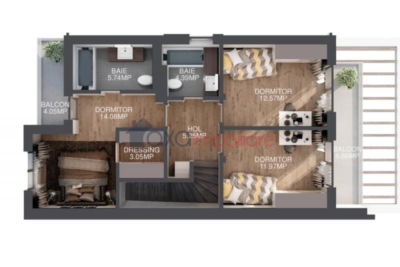 ETAJ / AL DOILEA NIVEL: hol, scara interioara, 1 dormitor matrimonial (cu baie proprie, dressing, balcon), 2 dormitoare, 1 baie comuna, 1 balcon.